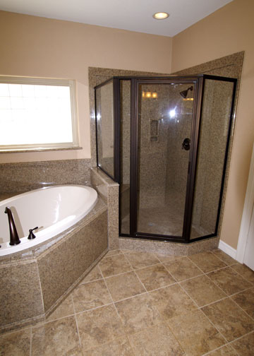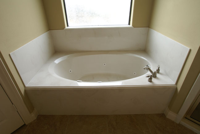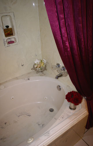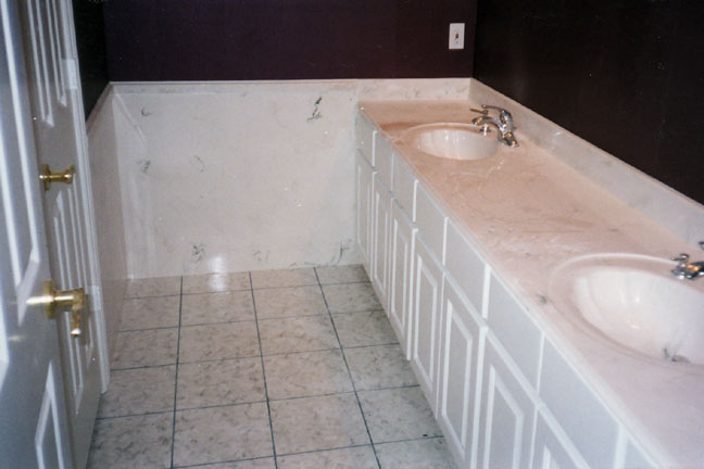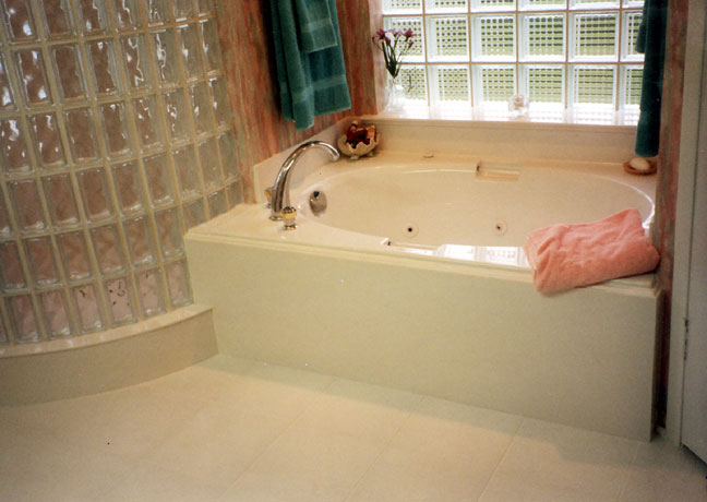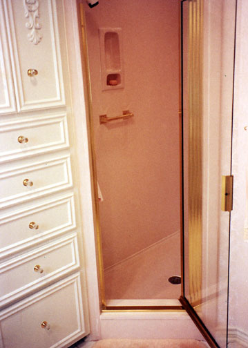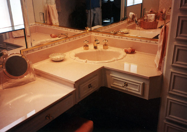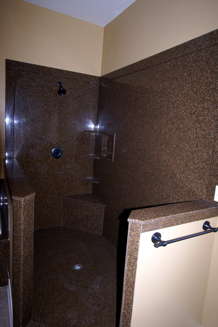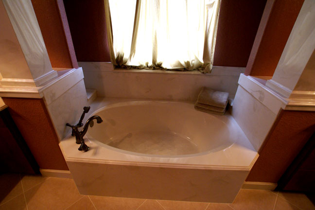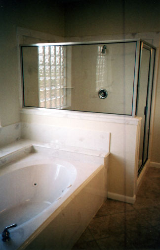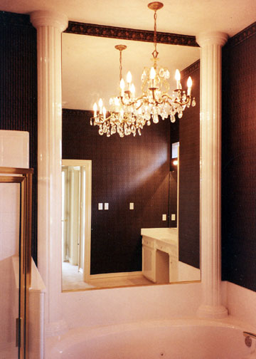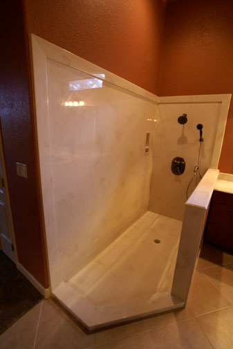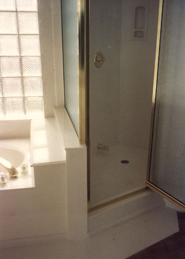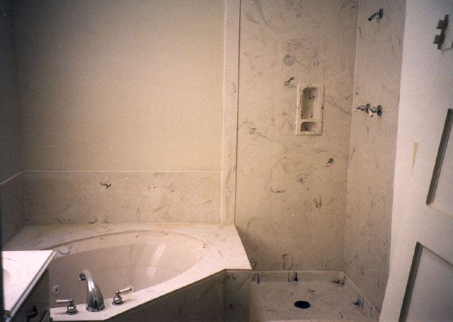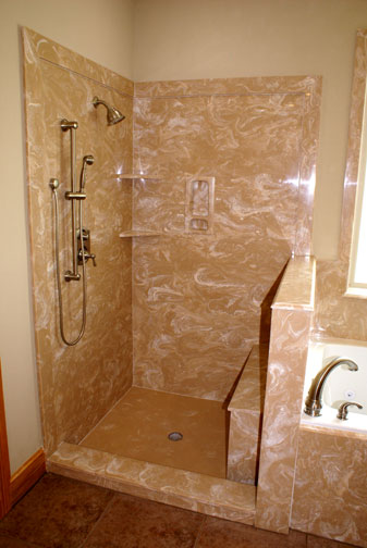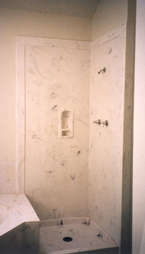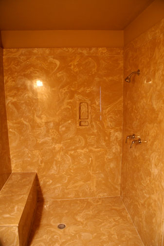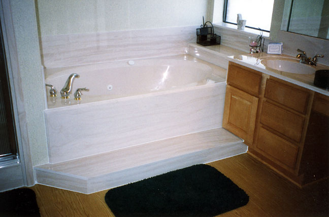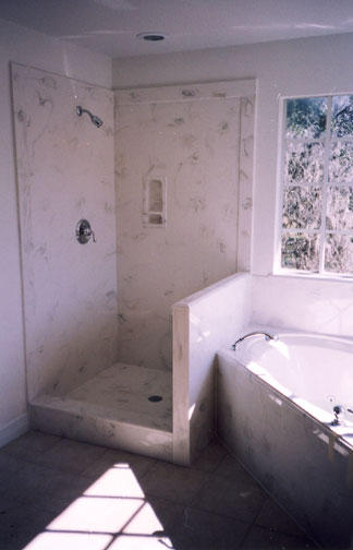 Above: made-to-order cultured marble bathtub, columns, tub surrounds and walk-in shower