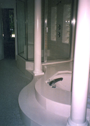 Above: made-to-order cultured marble bathtub, columns, tub surrounds and walk-in shower